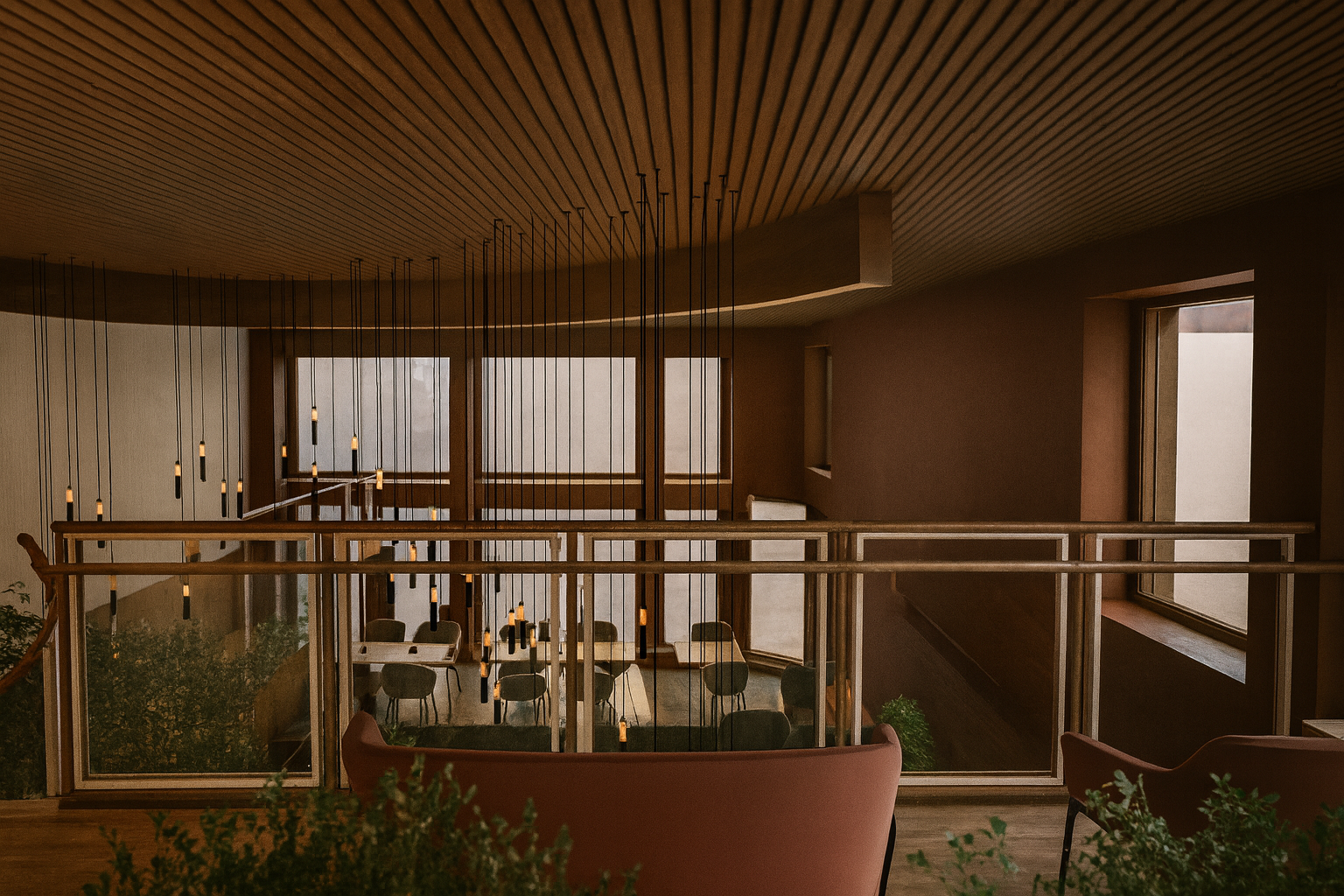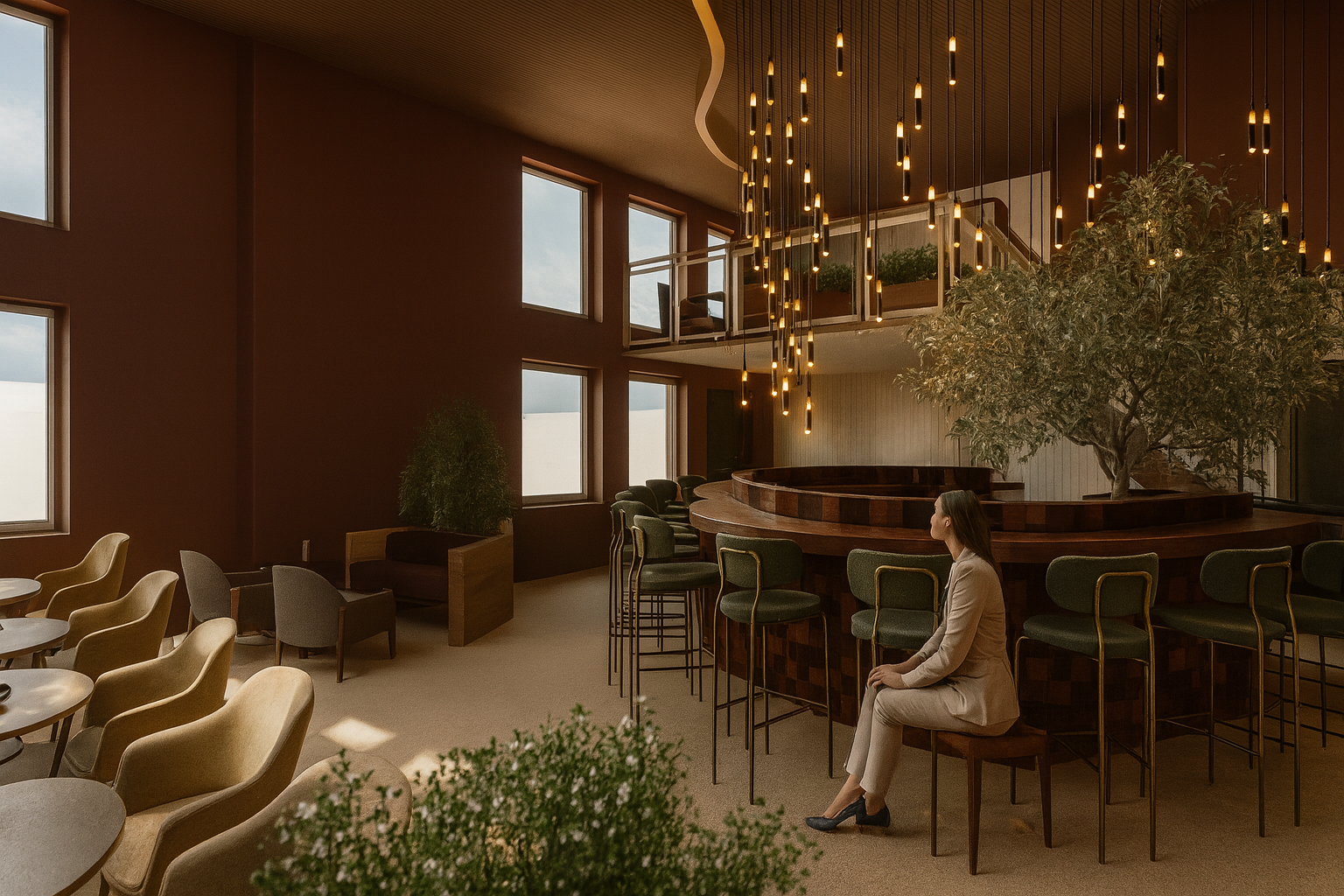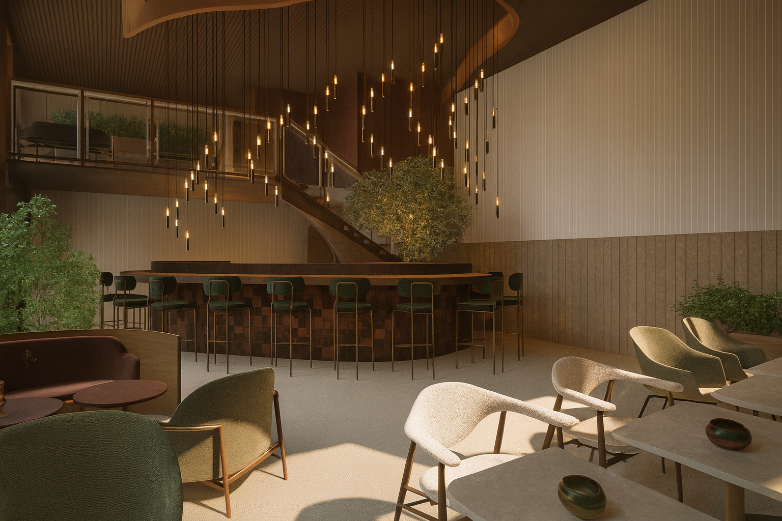 Het ontwerp van Daylight & Dusk draait om dualiteit. Overdag reflecteren natuurlijke materialen en zachte kleuren het daglicht, waardoor een rustige en energieke sfeer ontstaat. ’s Avonds versterken warme tinten, gericht licht en intieme zitopstellingen de sociale ervaring. De ruimte beweegt mee met het ritme van de dag en ondersteunt zowel activiteit als ontspanning.