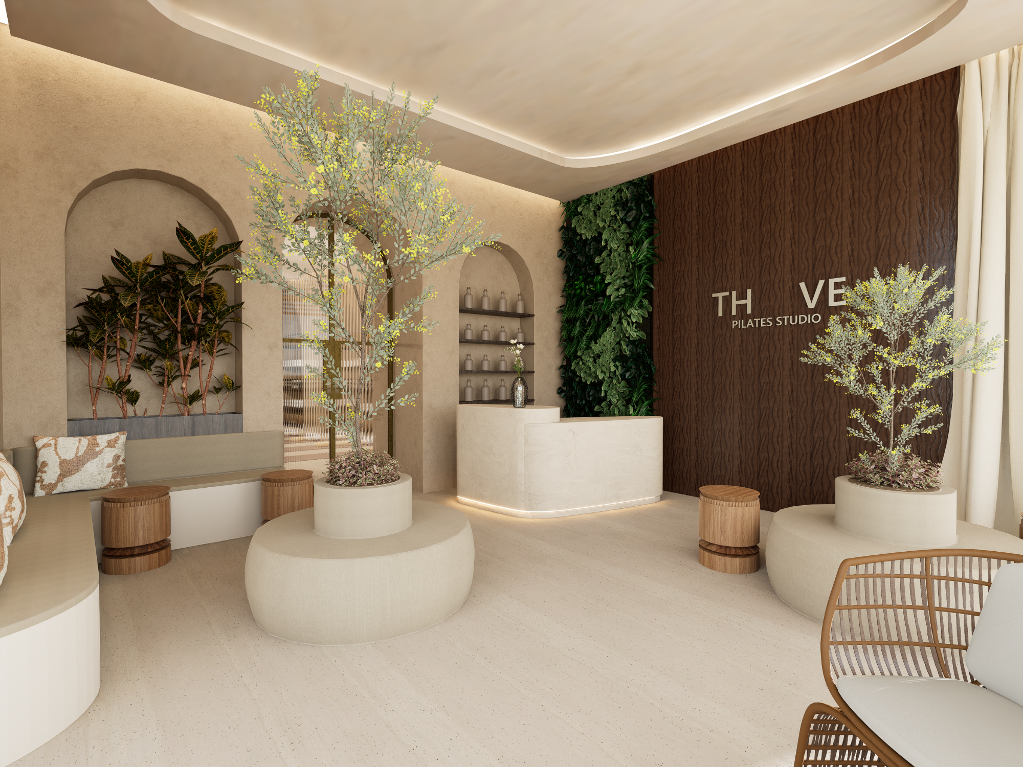 The design is inspired by Tulum, where natural textures, soft tones and greenery create a grounded and warm atmosphere. Organic shapes and a cohesive material palette ensure a seamless flow throughout the space, transitioning from light and open areas to more intimate and restorative zones.