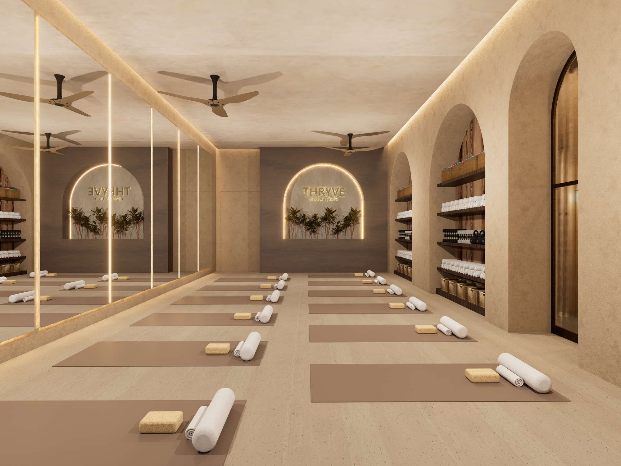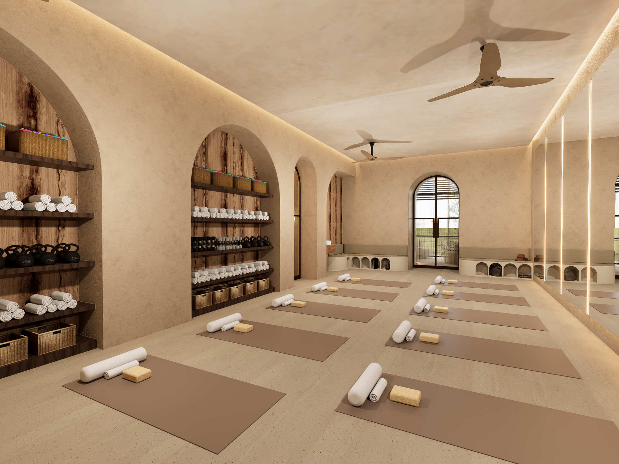 A neutral and calming palette allows focus during movement, while integrated storage and custom shelving keep the space organised and uncluttered. The repetition of arches and natural materials creates rhythm and consistency, enhancing both the visual experience and the sense of calm.