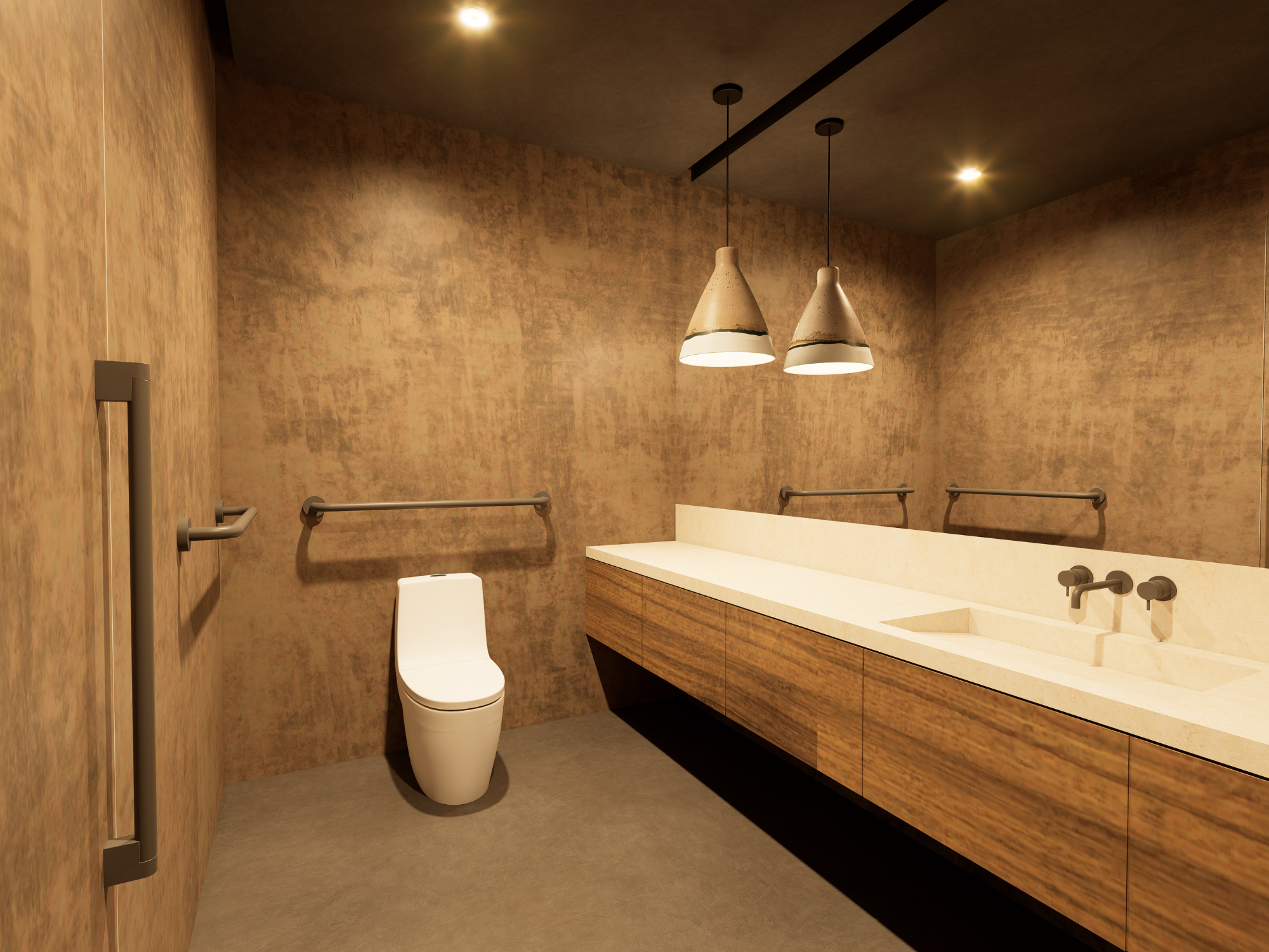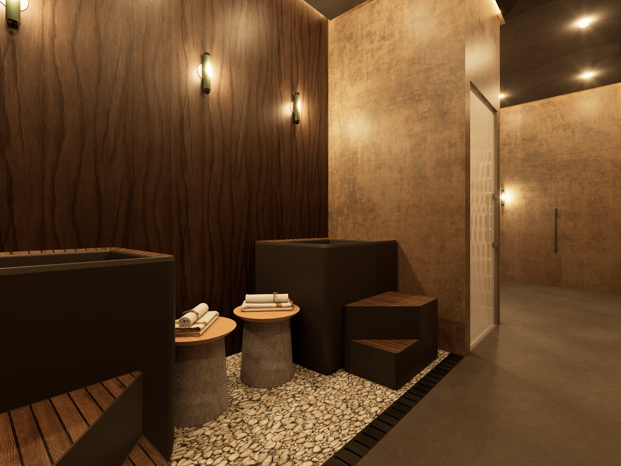 Darker tones, warm lighting and tactile materials create a calming, almost cocoon-like atmosphere. Natural stone, wood and pebble flooring enhance the sensory experience, while integrated elements such as seating and hidden storage contribute to both functionality and tranquility.