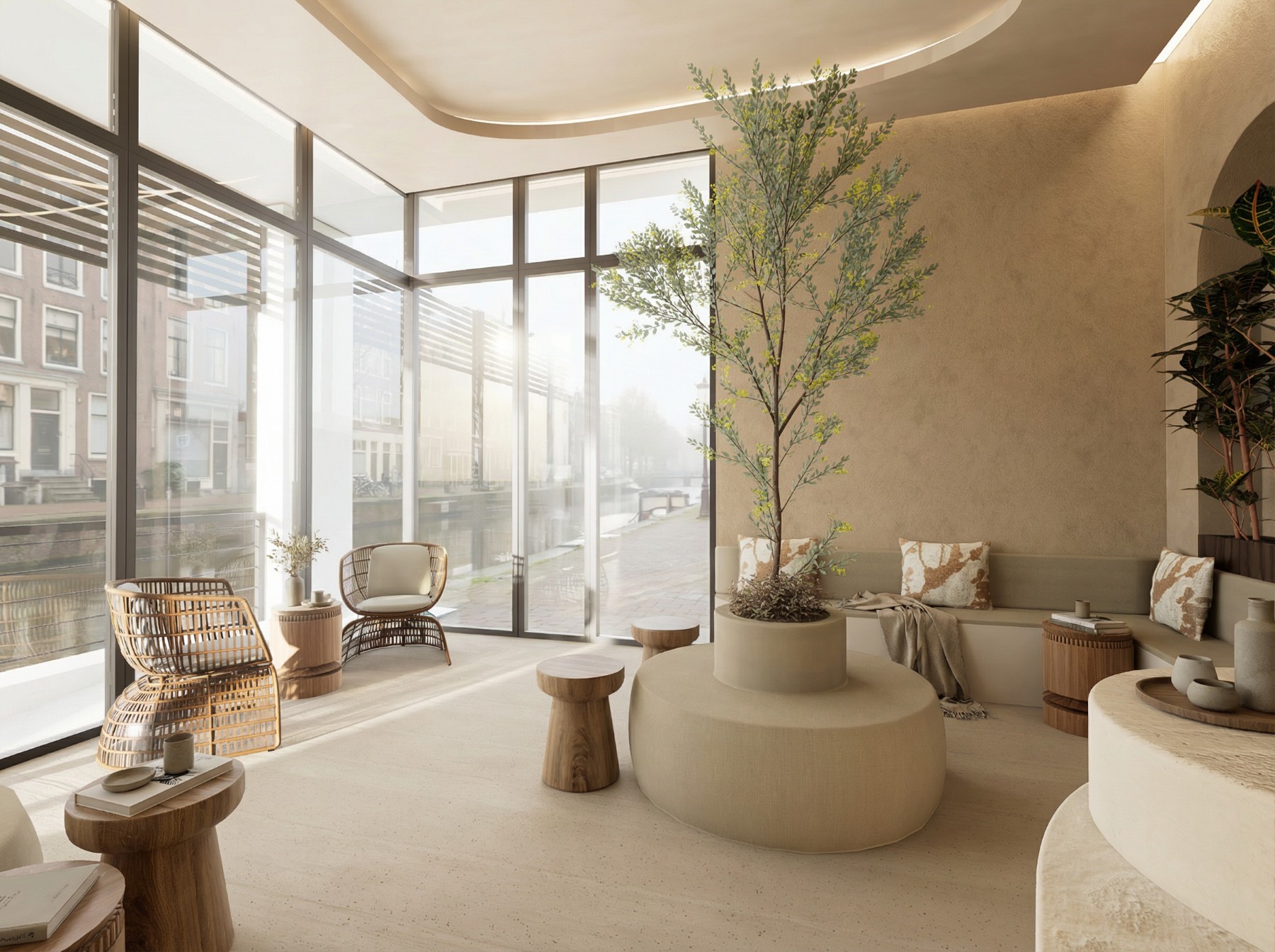Curved seating elements with integrated greenery encourage connection and create a soft, inviting first impression. Natural materials and warm tones set the tone for the entire experience, while the central layout allows for an easy and intuitive flow through the space.
