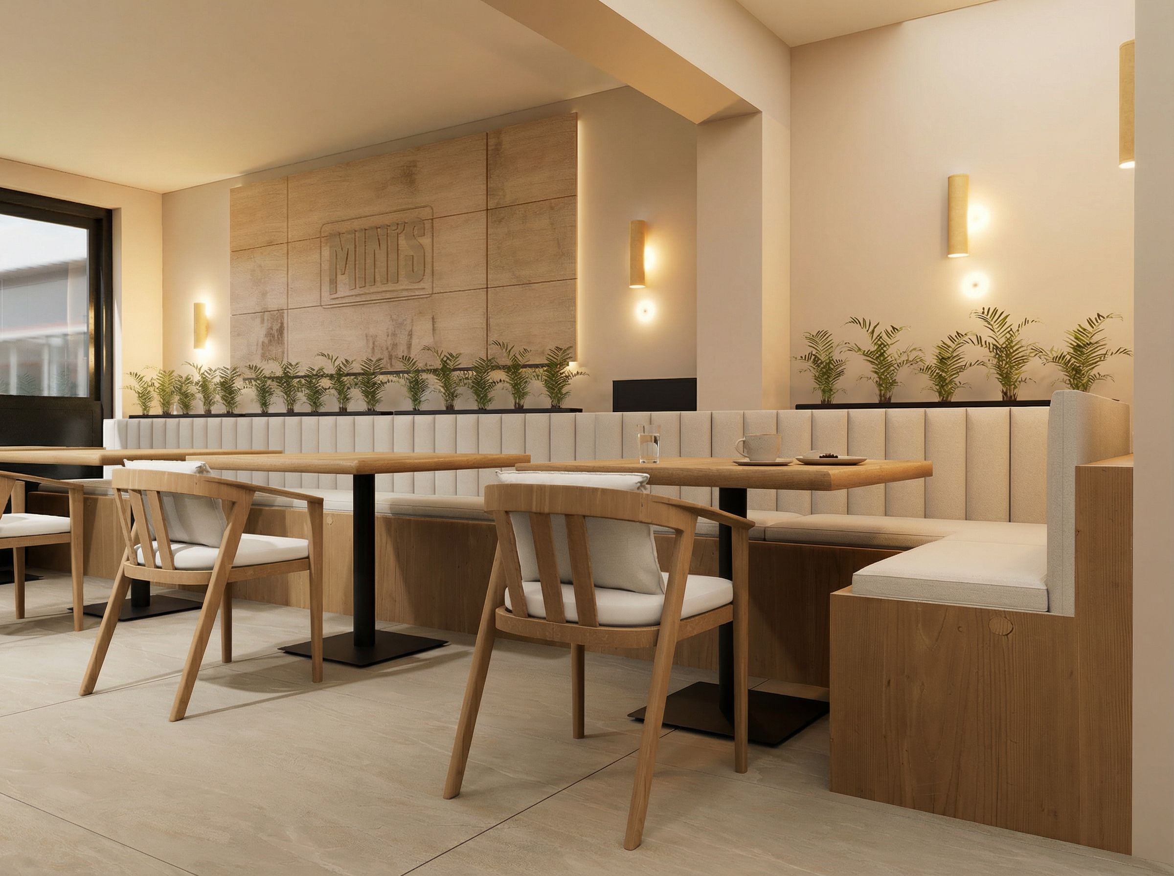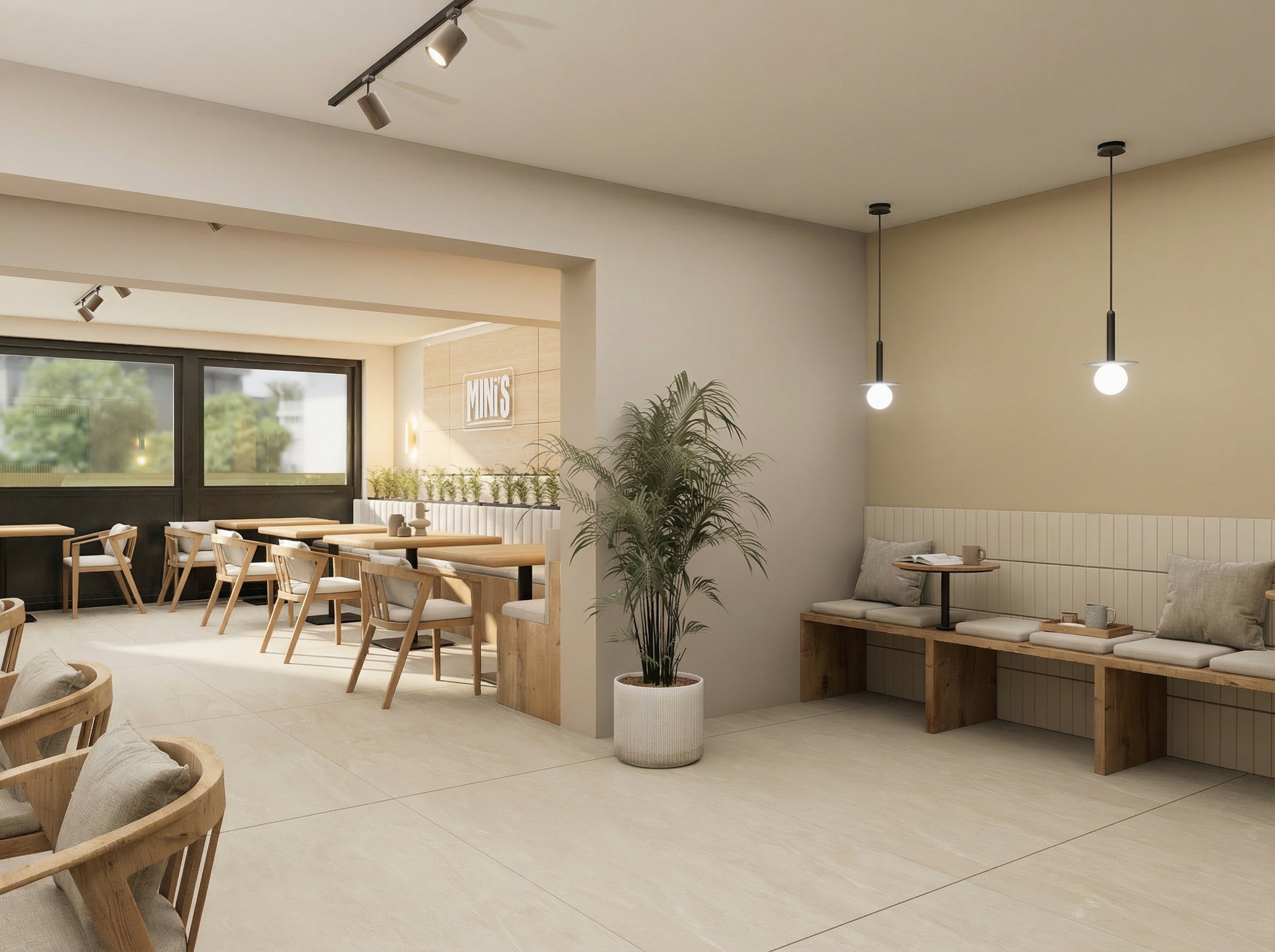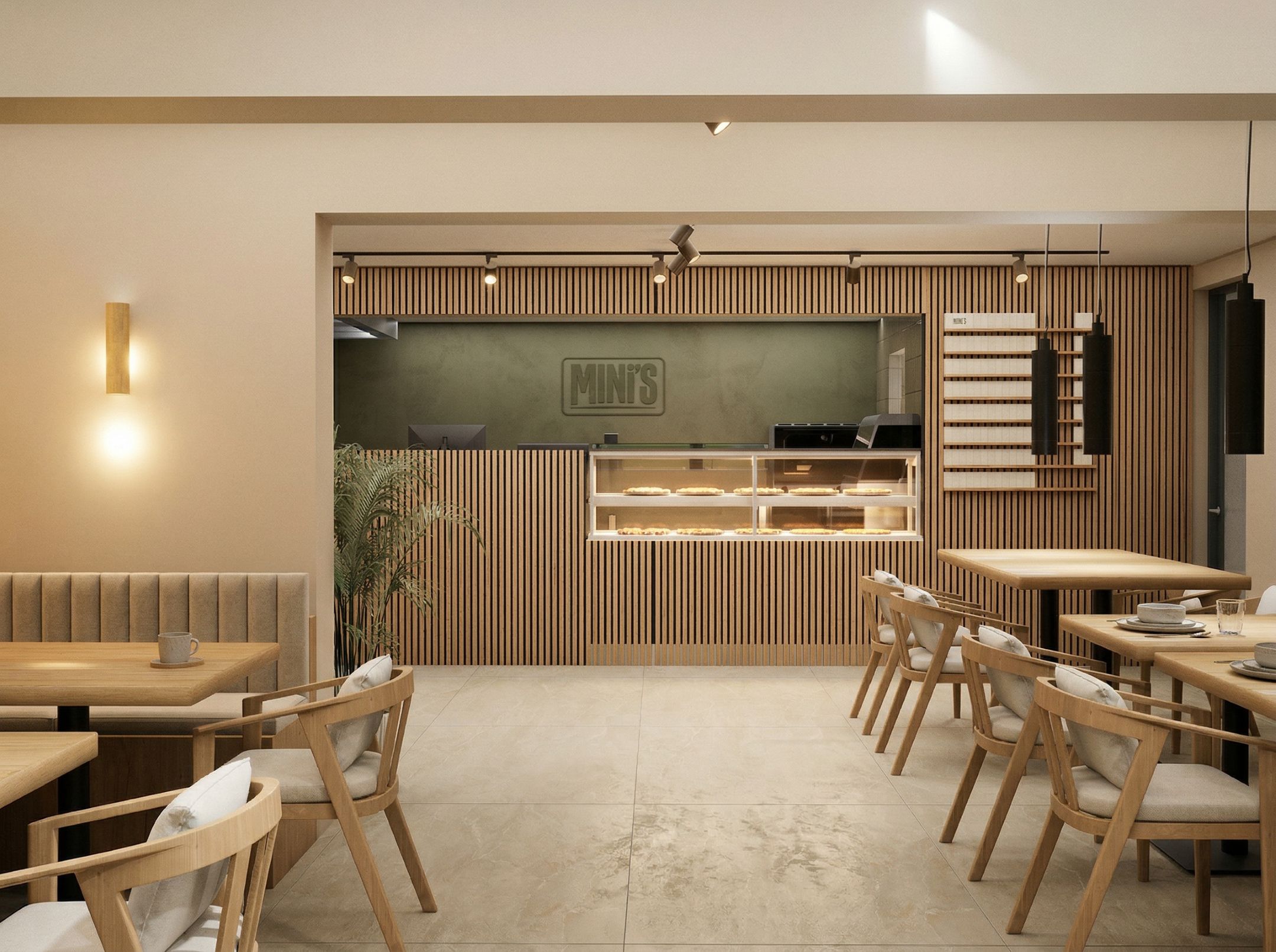 Voor Mini’s is gekozen voor een warm, minimalistisch interieur dat balans brengt tussen snelheid en kwaliteit. Het ontwerp ondersteunt een efficiënte workflow, terwijl de sfeer rustig en uitnodigend blijft. Door het gebruik van natuurlijke materialen, lichte kleuren en subtiele contrasten ontstaat een premium, maar toegankelijke uitstraling die past bij de doelgroep van professionals en mensen in hun lunchpauze.
