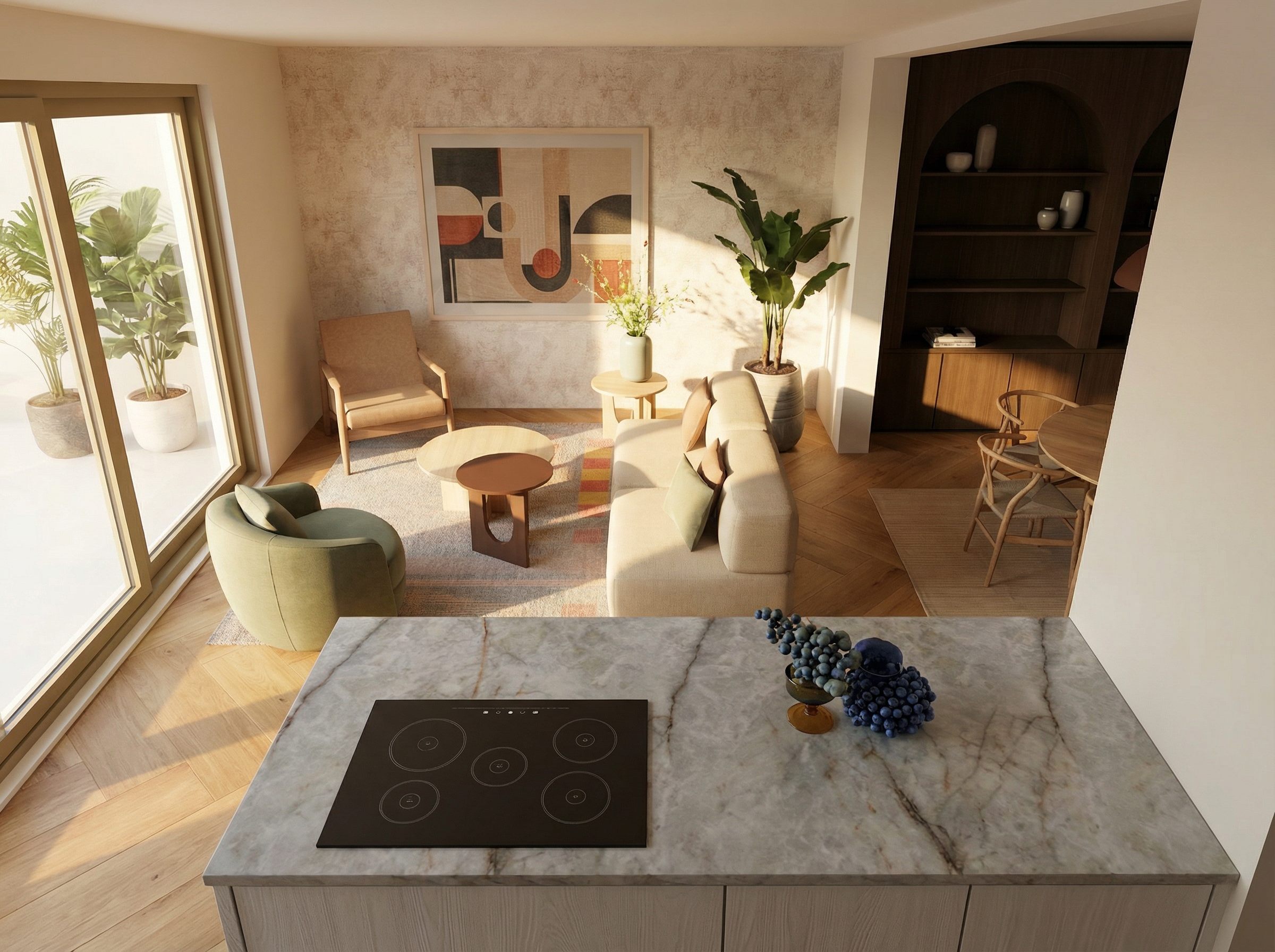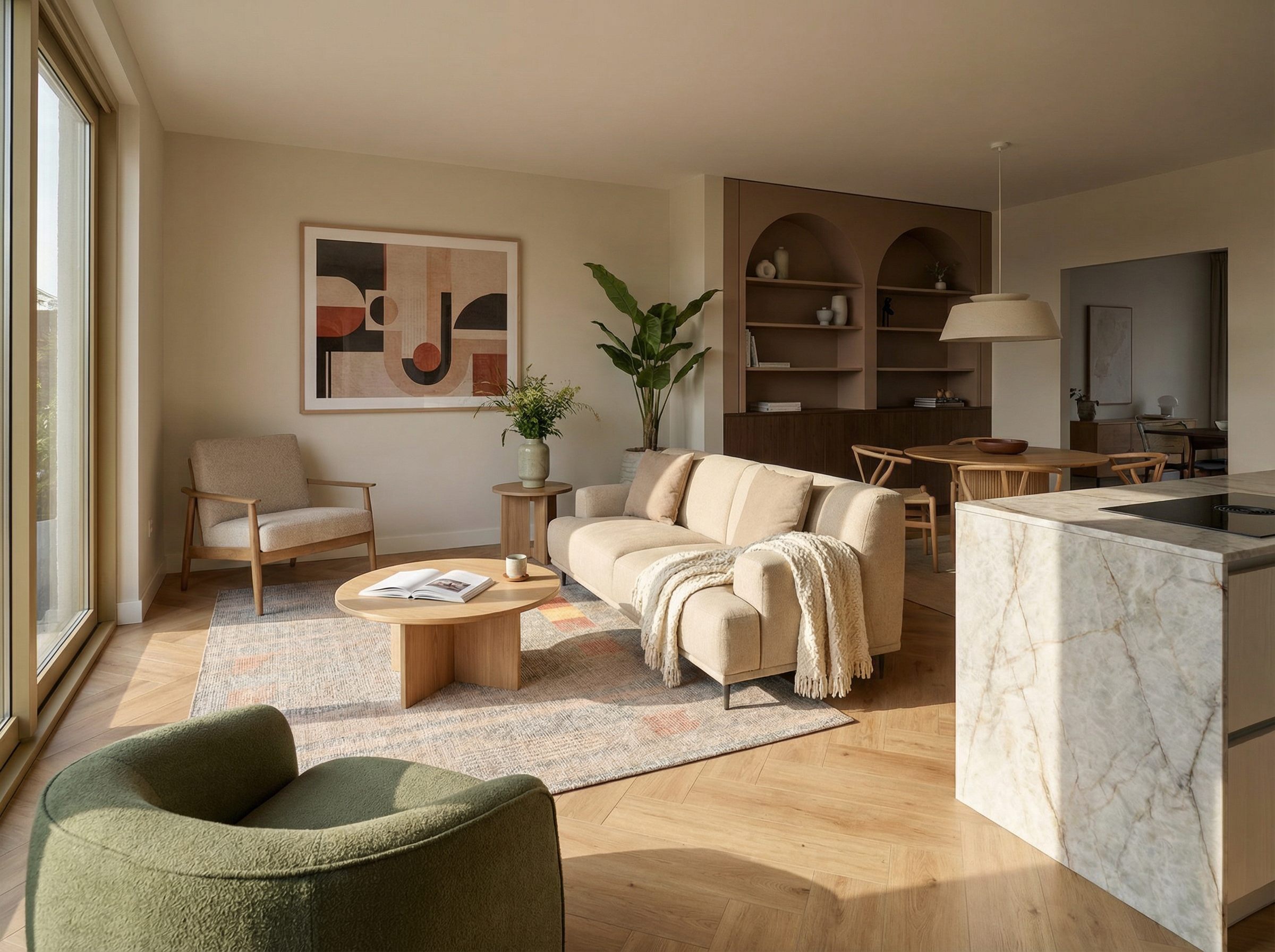 De groene fauteuil voegt karakter toe en verbindt het interieur met de natuurlijke elementen in de ruimte. In combinatie met het vloerkleed en de kunst ontstaat hier een gelaagd geheel dat warm aanvoelt zonder te druk te worden.