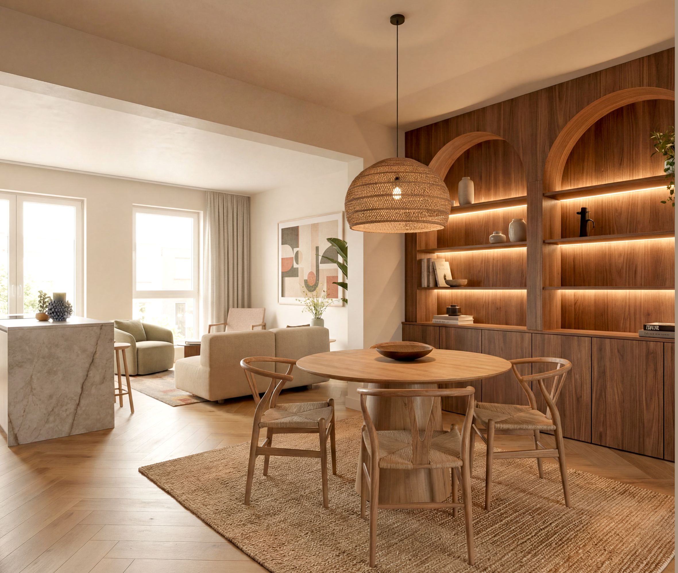 De maatwerk kast met warme houttinten en afgeronde vormen geeft karakter en zorgt voor een krachtig maar rustig statement. In combinatie met de ronde tafel en natuurlijke materialen ontstaat een plek die zowel functioneel als sfeervol is.