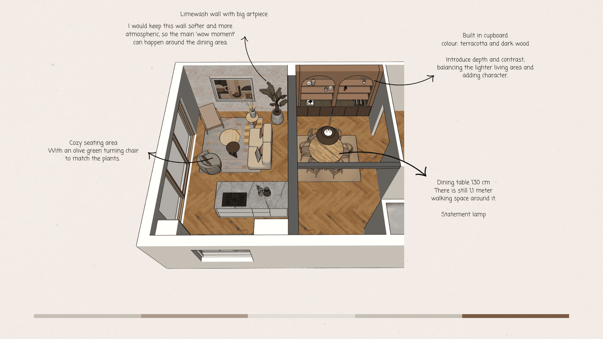 De zithoek is ontworpen als een plek om tot rust te komen. Door zachte vormen, warme materialen en een subtiele mix van kleuren ontstaat een comfortabele en uitnodigende sfeer.